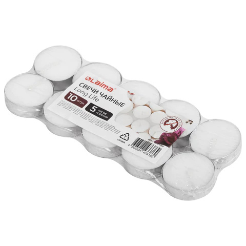 Свечи чайные Long Life, до 5 часов горения, вес 12 г, КОМПЛЕКТ 10 шт., в гильзе, LAIMA, 609199Артикул: 4505075.80