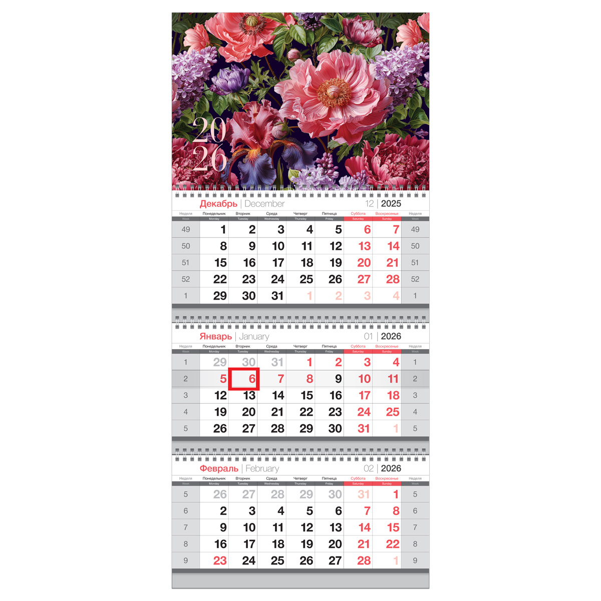Календарь квартальный 2026 г., 3 блока, 3 гребня, бегунок, мелован. бумага, BRAUBERG, "Цветы" 116811Артикул: 9747165.50