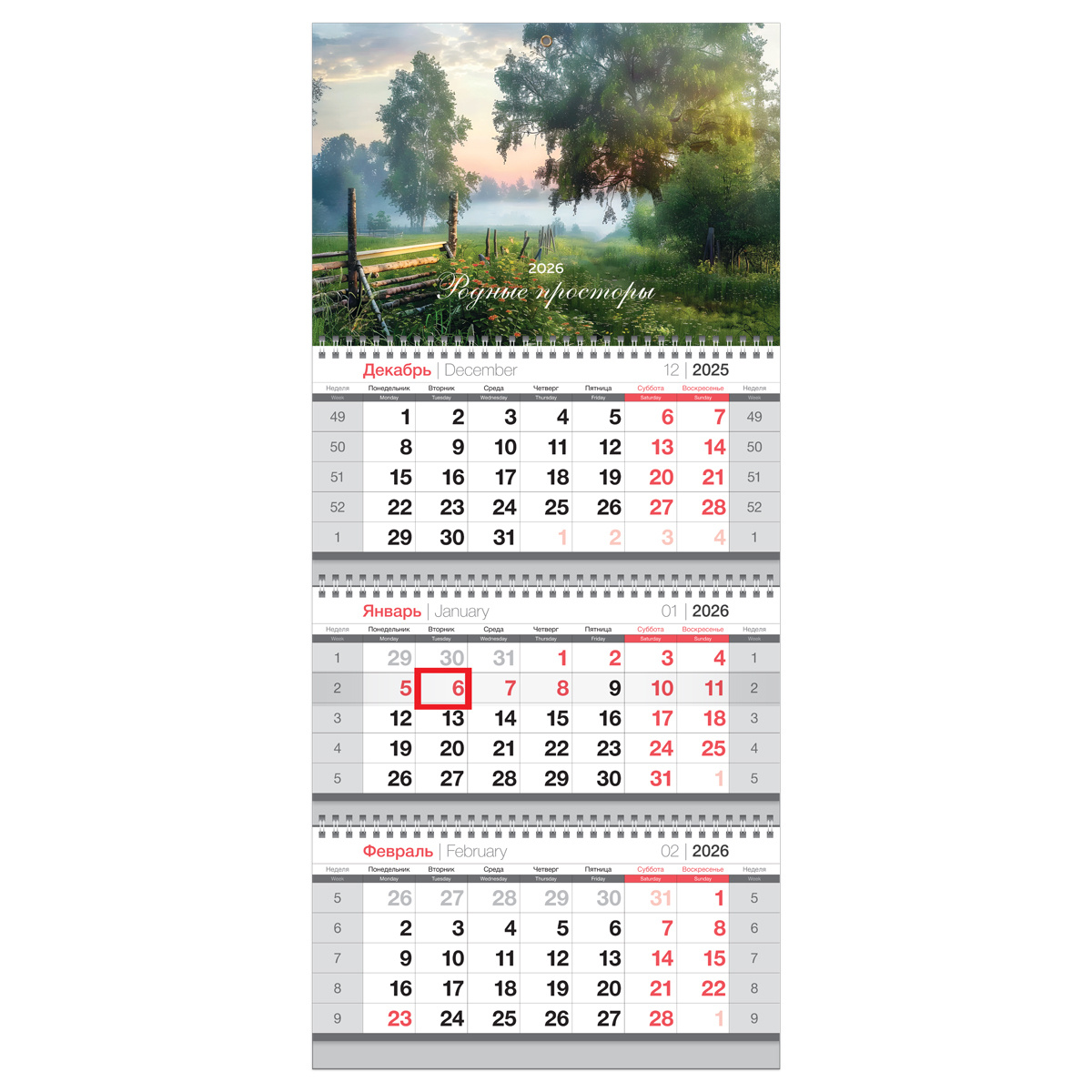 Календарь квартальный на 2026 г., 1 блок, 1 гребень, магнитый курсор, BRAUBERG, "Долина" 116914Артикул: 44423246.80
