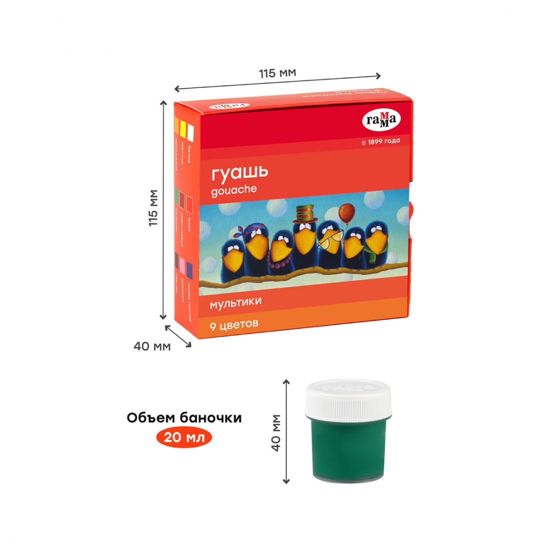 Набор гуаши серии «Мультики» разработан совместно с педагогами специально для детей школьного возраста от 6 до 9 лет. Краски изготовлены на основе натуральных компонентов и высококачественных пигментов, отличаются хорошей кроющей способностью и чистотой цвета. Легко наносятся на бумагу или картон, прекрасно смешиваются между собой. В наборе 9 баночек гуаши разных цветов: белый, жёлтый, оранжевый, алый, коричневый зелёный, синий тёмный, розовый, чёрный. Краски фасуются в удобные пластиковые герметичные баночки с логотипом на крышке. Объём каждой баночки с завинчивающейся крышкой — 20 мл, общий объём — 180 мл.
