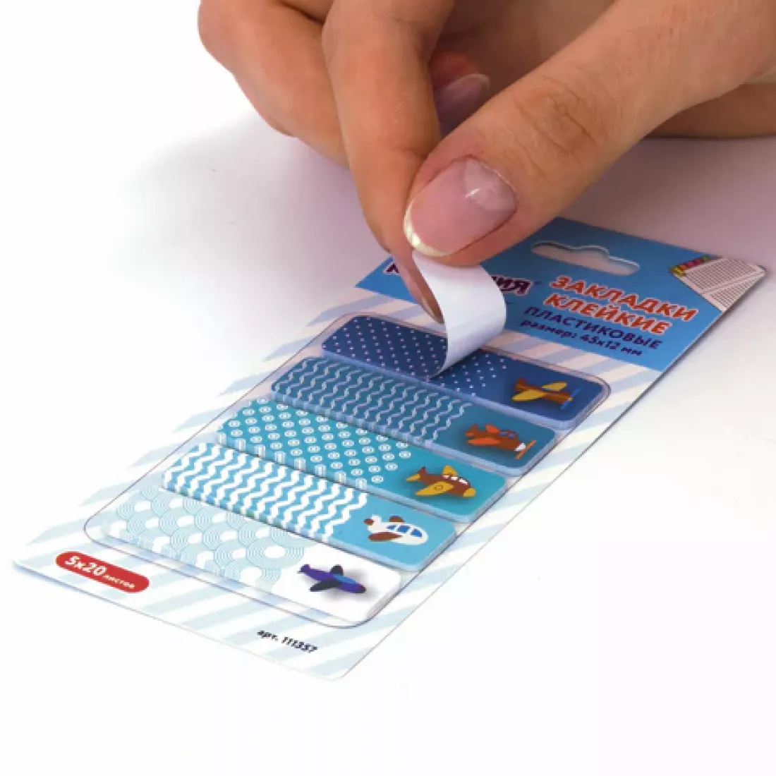 В наборе по 20 закладок каждого из 5 дизайнов. Размер закладки: 45х12 мм. Клейкий слой - 32 Н/м. Материал закладок позволяет делать на них надписи ручкой или карандашом. Поставляются в полиэтиленовом пакете с европодвесом.