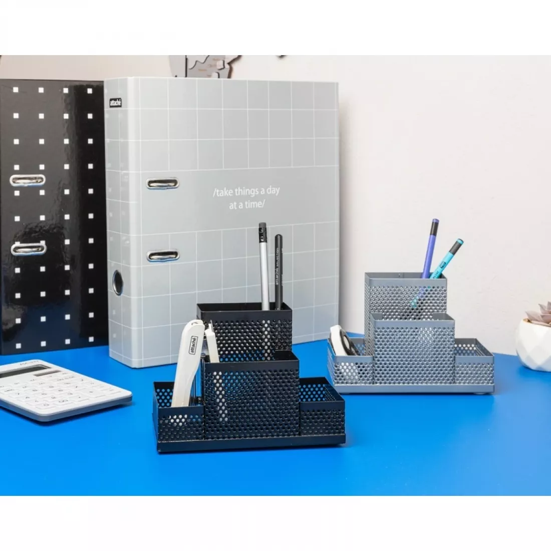 Подставка для канцелярских принадлежностей Attache Башня используется для хранения письменных принадлежностей и канцелярских мелочей, таких как скобы, зажимы, скрепки, стикеры, ручки, карандашии т. д. Эргономичная подставка-органайзер с 4 отделениями выполнена из легкой металлической сетки черного цвета. Подставка будет стильно выглядеть на рабочем столе, особенно если будет дополнена другими элементами коллекции из металла — лотками для бумаг, вертикальными накопителями.