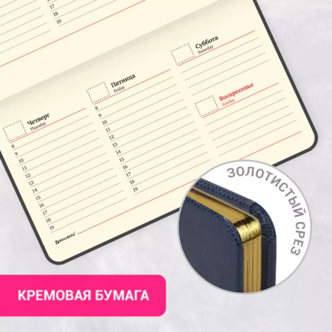 Внутренний блок включает 64 листа тонированной бумаги плотностью 70 г/м2. Благодаря малому формату А6 (95х155 мм) еженедельник удобно использовать как в офисе, так и на выездных деловых встречах. Твердая обложка, стилизованная под кожу рептилии, подходит для горячего тиснения. Дополнением является закладка-ляссе, с помощью которой при необходимости можно быстро открыть еженедельник на нужной странице. Помимо прочего, еженедельник снабжен обширным справочным материалом. Выполнен в благородном синем цвете.