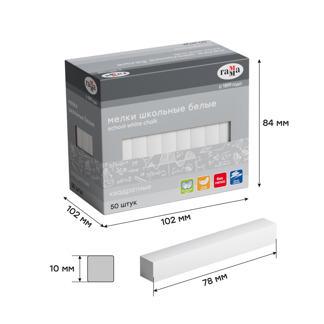 Квадратный школьный белый мягкий мел ГАММА подходит для письма или рисования на школьной доске и любой шероховатой поверхности. Длина мелка — 8 см. В наборе 50 мелков.