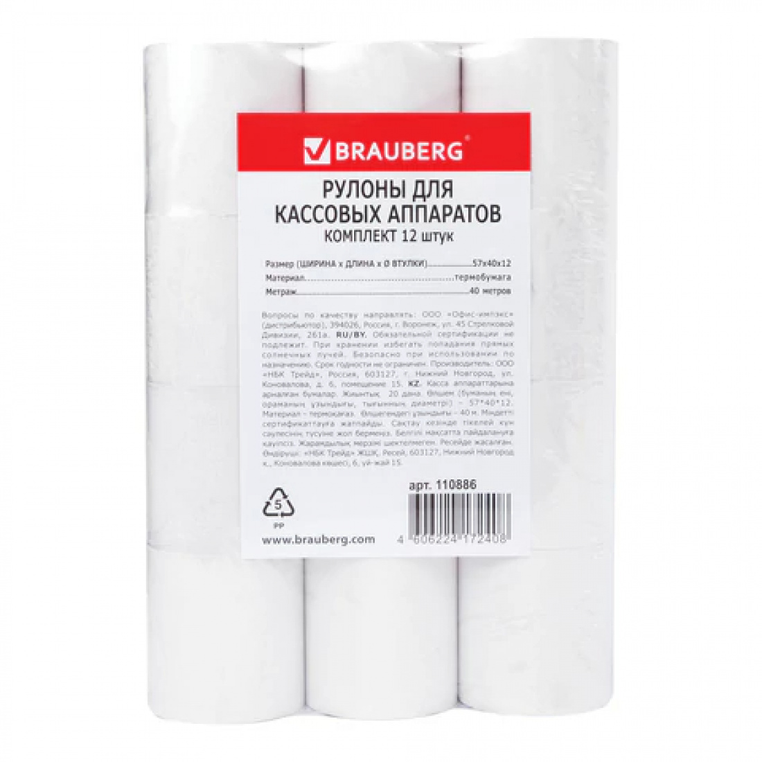 Кассовая лента 57мм (дл.40м, диам 12мм т/б) BRAUBERG 110886 (12/132)