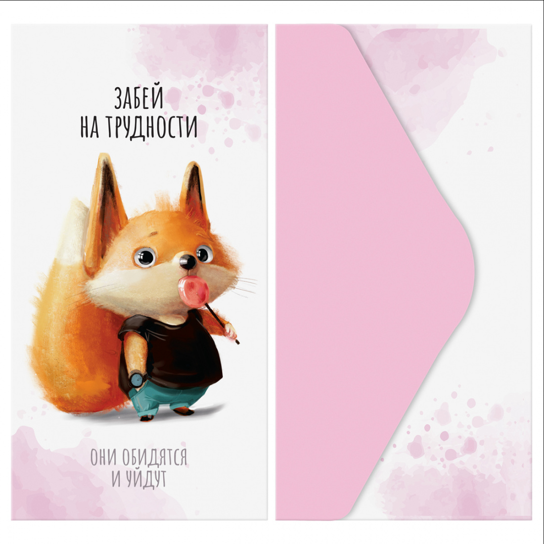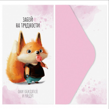 Размер конверта — 85*164 мм. Он сделан из плотного картона с матовой ламинацией. Дизайн с милыми животными и забавными надписями поднимет настроение. Универсальный конверт подходит для разных праздников.
