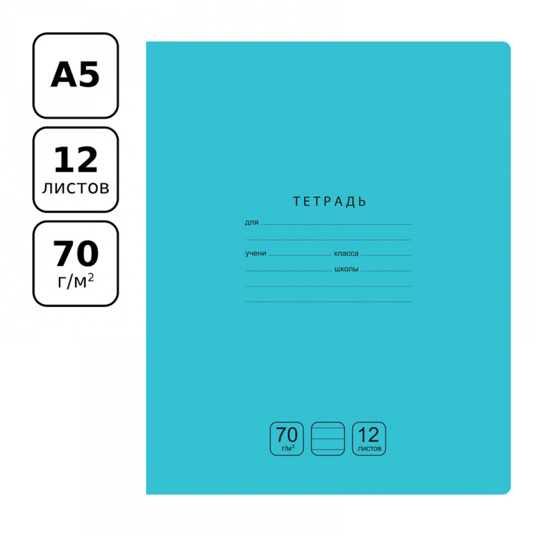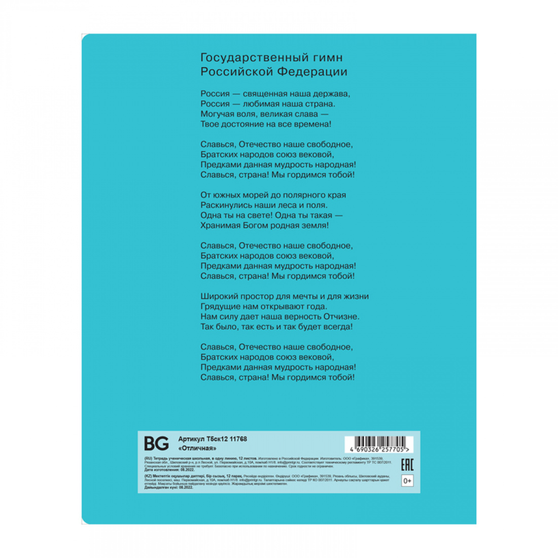 Школьная тетрадь BG серии «Отличная» формата А5 (165*205 мм) на скобе состоит из 12 листов и идеально подходит для письма шариковой, гелевой или капиллярной ручкой. Внутренний блок – офсетная бумага плотностью 70 г/м², белизна – 100%, линовка – линия с полями. Однотонная обложка тетради бирюзового цвета изготовлена из качественного мелованного картона. Обложка и внутренний блок имеют скругленные уголки. Сзади на обложке размещён Гимн России. Тетради упакованы в термоусадочную пленку по 10 штук.