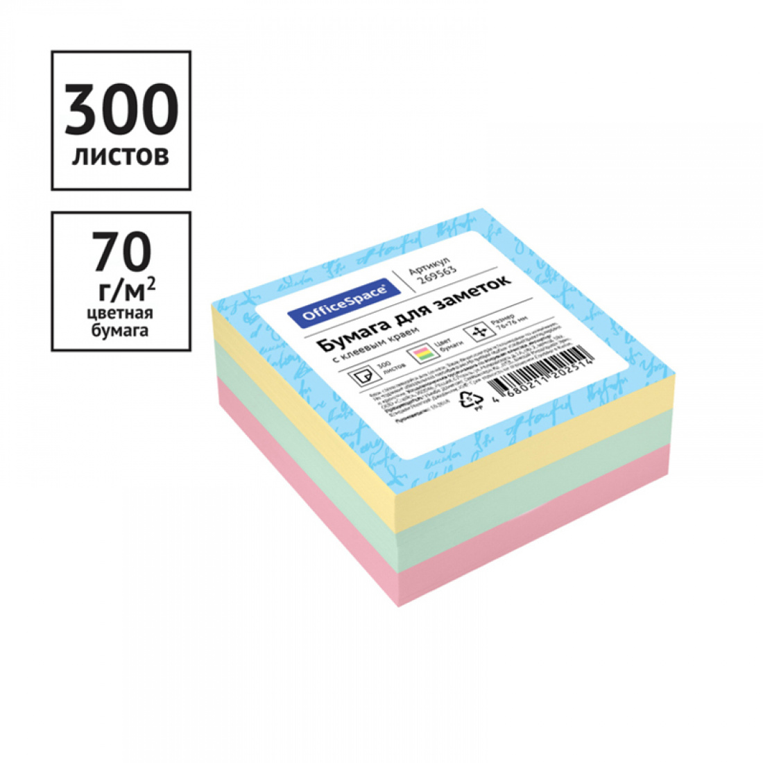 Липкий блок 76*76мм "OfficeSpace" 300л., 3цвета, 269563 (6/96)