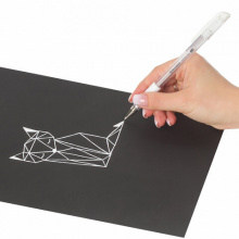 Гелевая ручка с прозрачным корпусом и резиновым держателем для удобства письма, исключающим скольжение пальцев. Ручка имеет сменный стержень - 130 мм, что позволяет увеличить срок службы. Диаметр пишущего узла 1 мм создает тонкую линию письма, равную 0,5 мм. Белые чернила равномерно распределяются на бумаге.