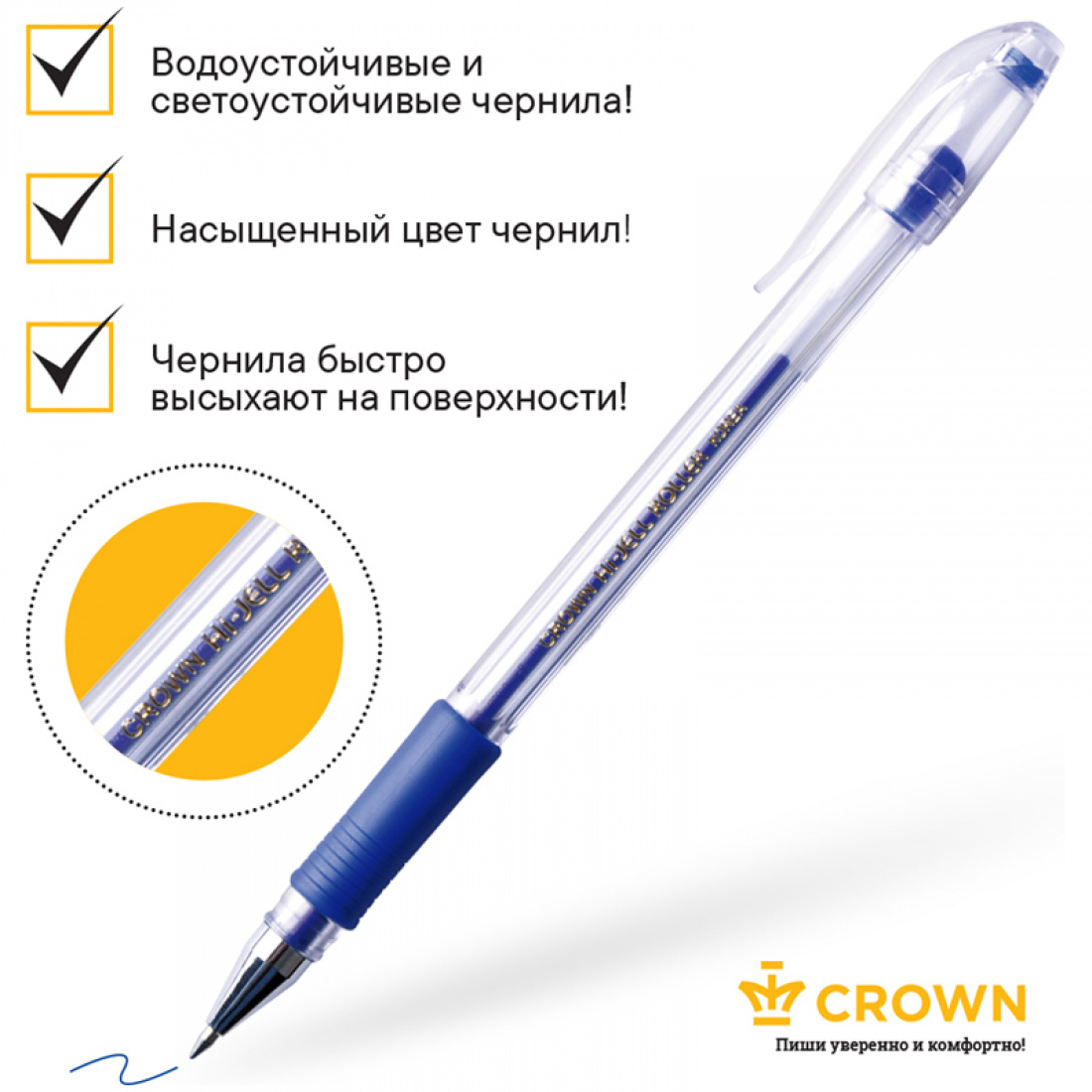 Ручка гелевая Crown "Hi-Jell Grip" синяя, 0,5мм, грип, HJR-500RB (12)