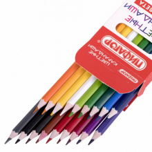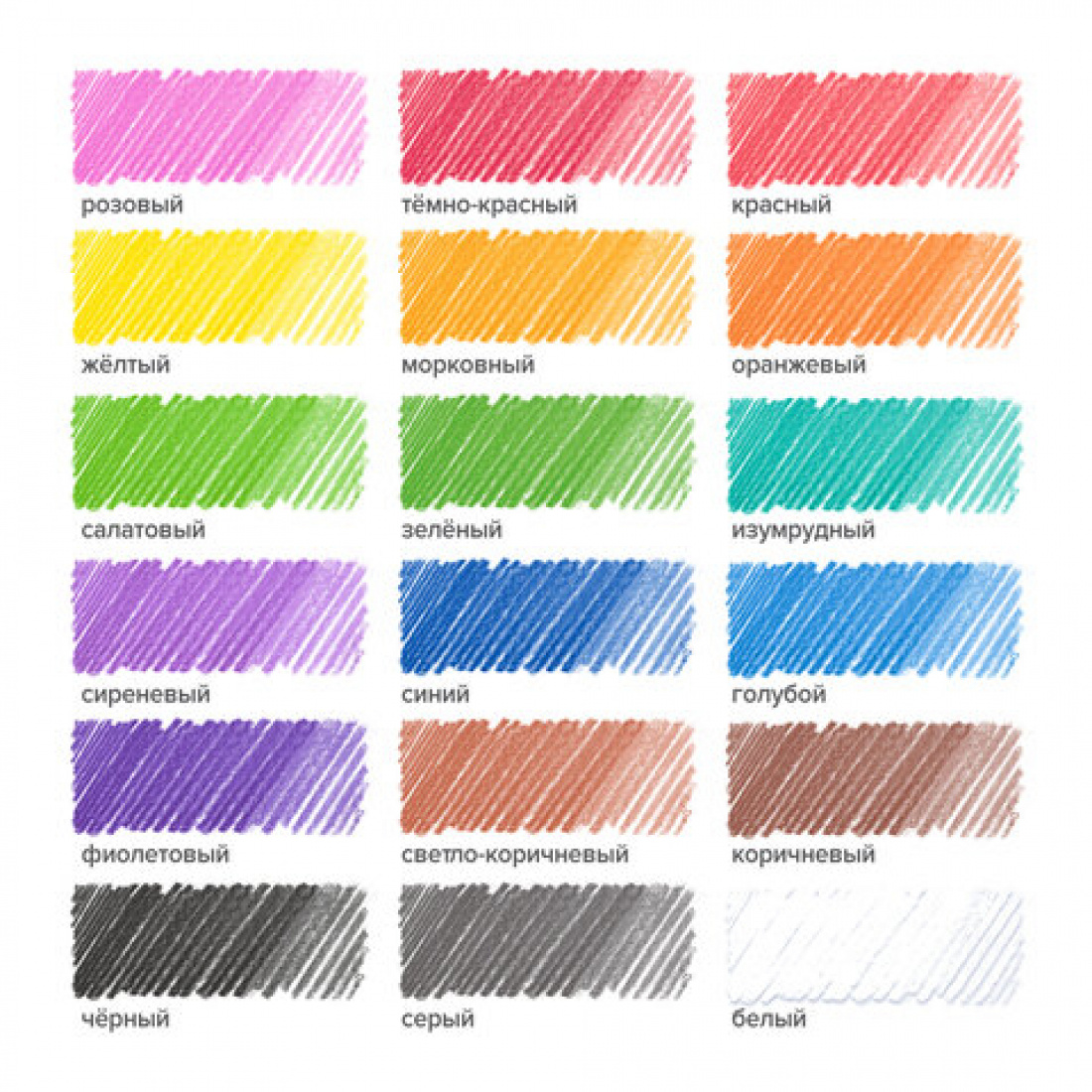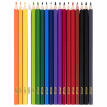 Набор состоит из 18 цветов: лимонный, желтый, оранжевый, розовый, красный, лиловый, салатовый, зеленый, темно-зеленый, голубой, васильковый, синий, серо-синий, коричневый, темно-коричневый, темно-серый, черный. Шестигранная форма сечения корпуса позволяет карандашу не скатываться с поверхности стола во время занятий рисованием.
