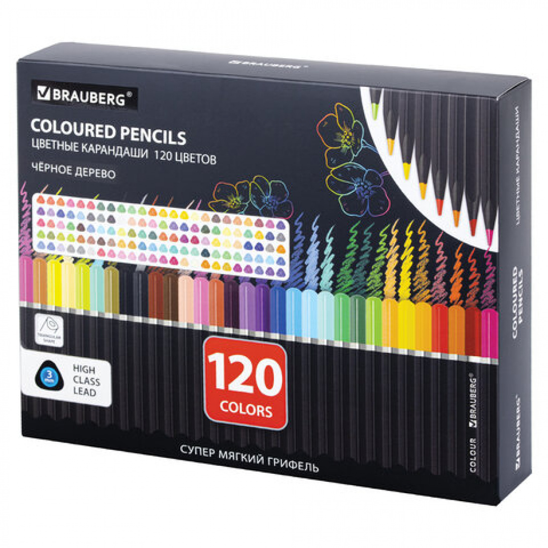 Карандаши 120 цв. BRAUBERG BLACK мягкие, трехгранные, 3мм, черное дерево, 182046