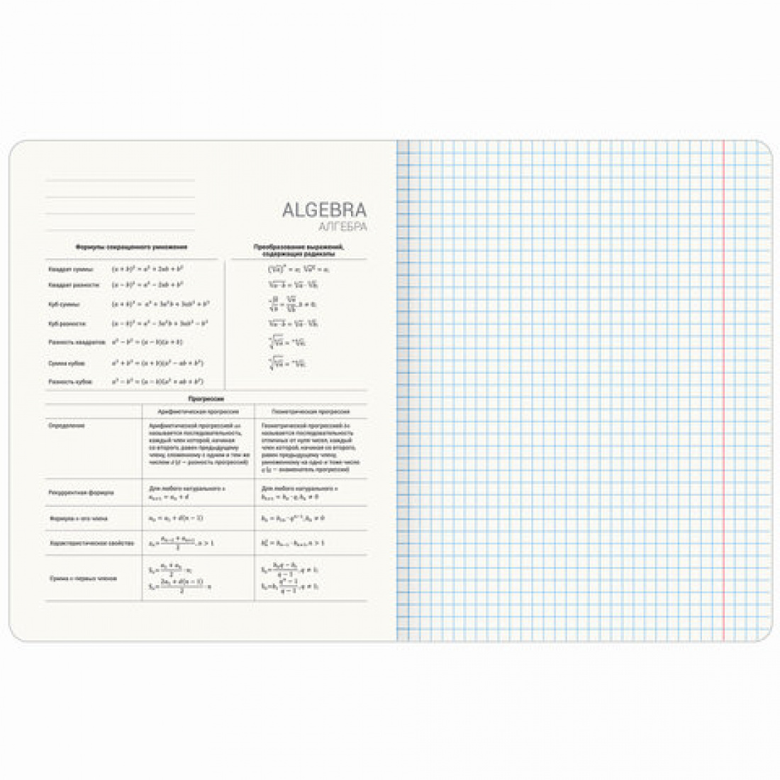 Тетрадь по алгебре формата А5 (165х205 мм) содержит 48 листов, изготовленных из высококачественной офсетной бумаги плотностью 60 г/м2 и белизной 100%. Листы соединены скобами. Линовка блока – в клетку, красные поля. Обложка выполнена из мелованного картона плотностью 190 г/м2. Ламинация SoftTouch обеспечивает обложке мягкий, бархатистый тактильный эффект. Углы тетради скруглены. В справочном материале для учащихся собраны основные подсказки по школьному предмету.