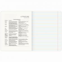 Тетрадь по литературе формата А5 (165х205 мм) содержит 48 листов, изготовленных из высококачественной офсетной бумаги плотностью 60 г/м2 и белизной 100%. Листы скреплены скобами. Блок линован в линию, с красными полями.