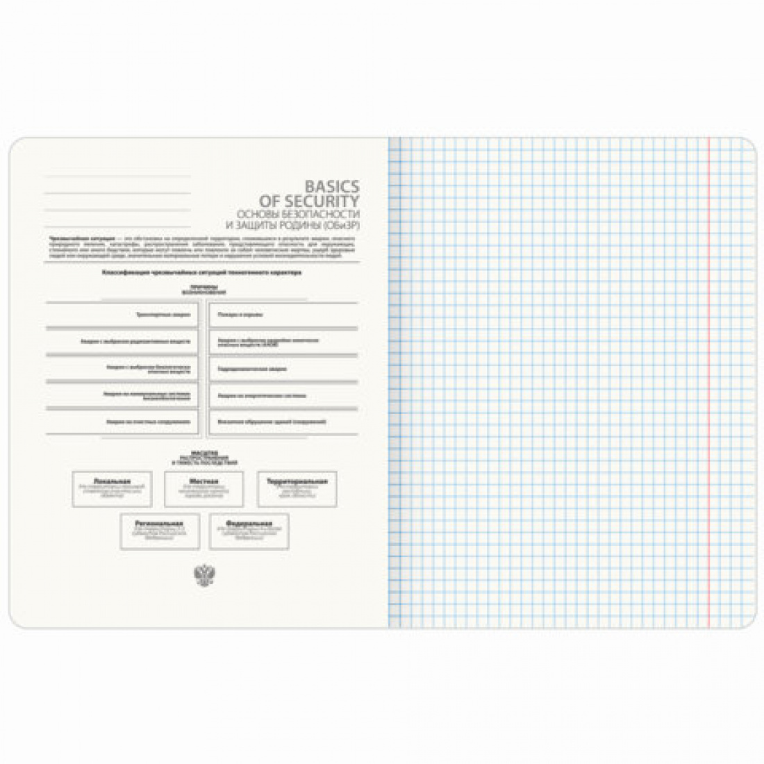 Тетрадь по ОБиЗР формата А5 (165х205 мм) содержит 48 листов, изготовленных из высококачественной офсетной бумаги плотностью 60 г/м2 и белизной 100%. Листы скреплены скобами. Блок линован в клетку, с красными полями.