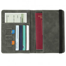 Модель выполнена из экокожи графитового цвета c приятной на ощупь soft touch-поверхностью и украшена тиснением в виде надписи "Passport", "travel wallet" и силуэта самолета.