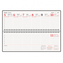Внутренний блок содержит 64 листа офсетной бумаги белого цвета плотностью 70 г/м2. Обложка из бордовой экокожи и твердый переплет обеспечивают долгий срок службы. Для заметок в планинге имеется 11 страниц в конце внутреннего блока. Подходит для горячего тиснения. Скрепление осуществляется с помощью евроспирали. Размер изделия – 305х140 мм.