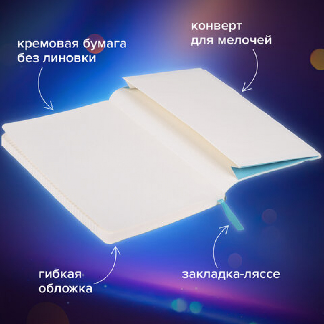 Мягкая интегральная обложка стилизована под "классическую кожу". Имеет закругленные уголки, подходит для горячего тиснения и имеет резинку-фиксатор, благодаря чему не раскроется в сумке или портфеле и листы не помнутся. На внутренней стороне задней обложки есть декоративный конверт для разных мелочей в виде визиток, напоминалок или других милых и полезных мелочей. 96 листов позволят зафиксировать большой объем информации. Блок без линовки дает возможность аккуратно заполнить цифровые значения, вести записи, а также нанести чертежные и художественные зарисовки. Внутренний блок выполнен из офсета цвета слоновой кости плотностью 80 г/м2 и крепится к обложке с помощью книжного переплета. Дополнением является закладка-ляссе, с помощью которой при необходимости можно быстро открыть нужную страницу. Формат блокнота А5 (130х210 мм) позволит владельцу поместить его в кейс или сумку малых габаритов.