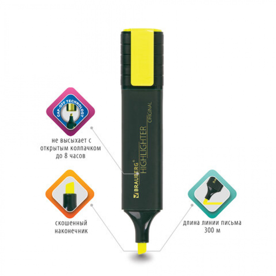 Текстовыделитель BRAUBERG "ORIGINAL" предназначен для выделения текста на бумаге любого типа, включая факс-бумагу.