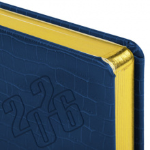 Внутренний блок включает 168 листов тонированной бумаги плотностью 70 г/м2. Каждая страничка имеет перфорированный угол. Благодаря стандартному формату А5 (138х213 мм) ежедневник удобно использовать как в офисе, так и на выездных деловых встречах. Материал обложки насыщенного синего цвета подходит для горячего тиснения. Срез ежедневника украшен золотым фольгированием – это подчеркивает премиальность изделия.