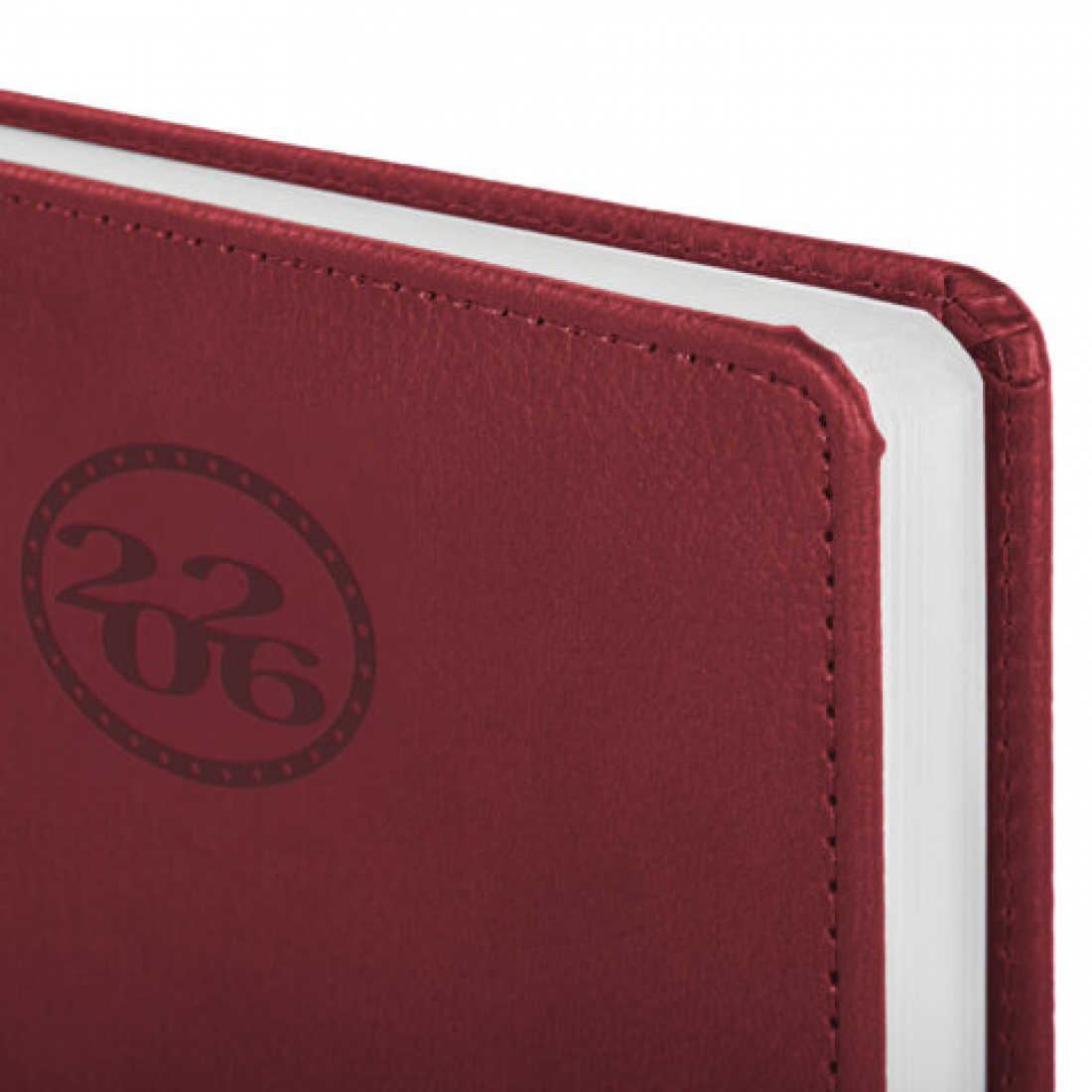 Внутренний блок включает 168 листов белой бумаги плотностью 70 г/м2. Каждая страничка имеет перфорированный угол. Благодаря стандартному формату А5 ежедневник удобно использовать как в офисе, так и на выездных деловых встречах. Обложка с прошивкой по периметру имеет ярко выраженную текстуру под кожу, приятную на ощупь. Материал обложки подходит для горячего тиснения.