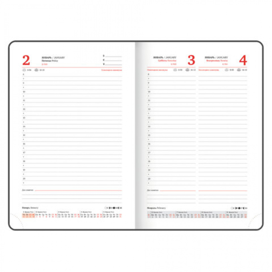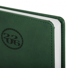 Внутренний блок включает 168 листов белой бумаги плотностью 70 г/м2. Каждая страничка имеет перфорированный угол. Благодаря стандартному формату А5 ежедневник удобно использовать как в офисе, так и на выездных деловых встречах. Обложка с прошивкой по периметру имеет ярко выраженную текстуру под кожу, приятную на ощупь. Материал обложки подходит для горячего тиснения.