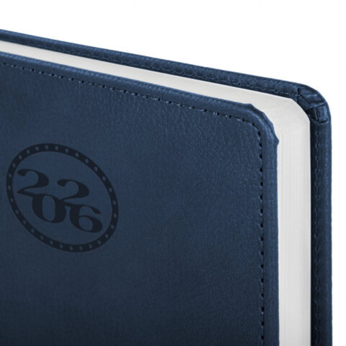 Внутренний блок включает 168 листов белой бумаги плотностью 70 г/м2. Каждая страничка имеет перфорированный угол. Благодаря стандартному формату А5 ежедневник удобно использовать как в офисе, так и на выездных деловых встречах. Обложка с прошивкой по периметру имеет ярко выраженную текстуру под кожу, приятную на ощупь. Материал обложки подходит для горячего тиснения.