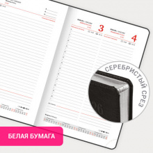 Внутренний блок включает 168 листов белой бумаги плотностью 70 г/м2. Каждая страничка имеет перфорированный угол. Благодаря стандартному формату А5 (138х213 мм) ежедневник удобно использовать как в офисе, так и на выездных деловых встречах.