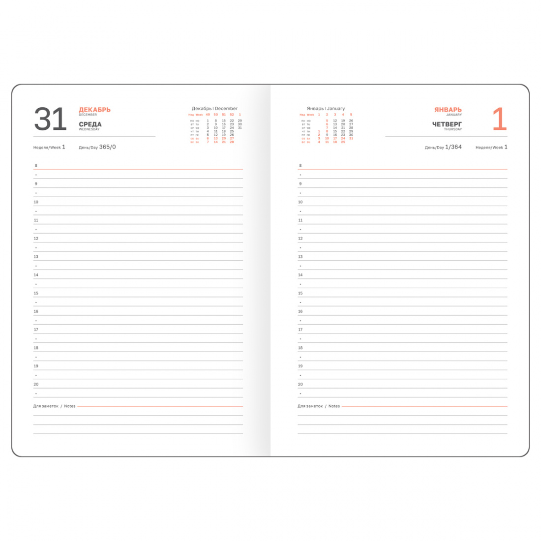 Перфорированные уголки и закладка-ляссе обеспечат комфорт и удобство при использовании. В ежедневнике предусмотрена справочная информация, ежемесячный планер, календарь и другие полезные сведения. Подходит под персонализацию. Индивидуальная упаковка в термоусадочную пленку.