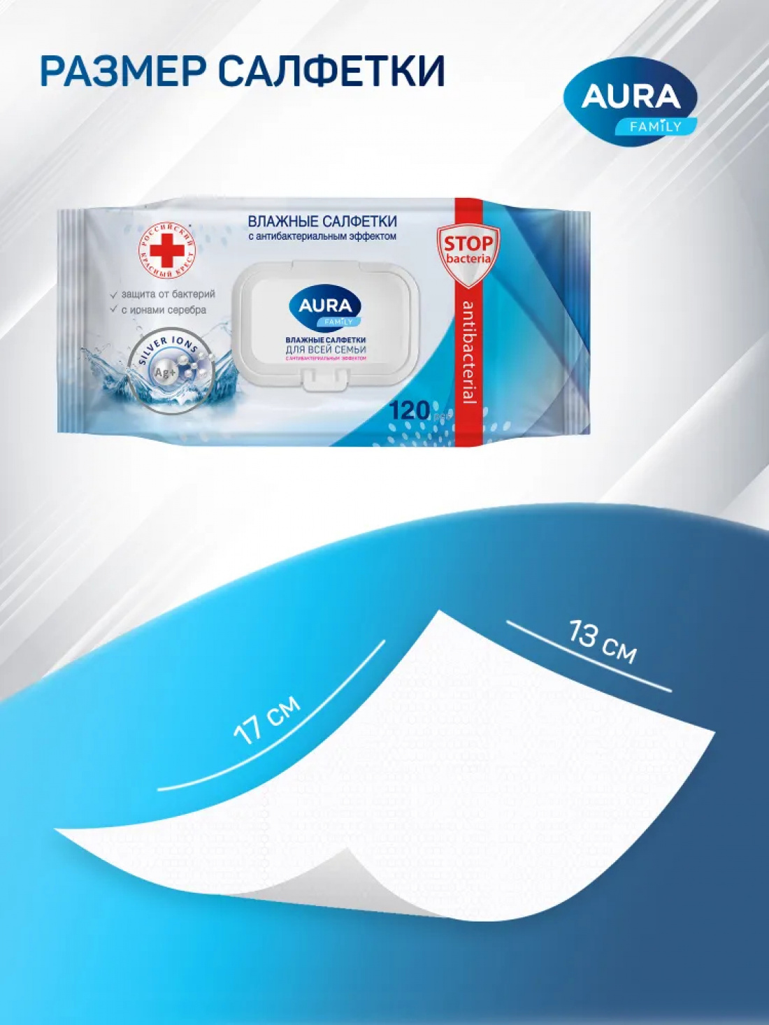 Салфетки влажные Aura "Family", 120шт., антибактериальные, для всей семьи, крышка клапан, 92342
