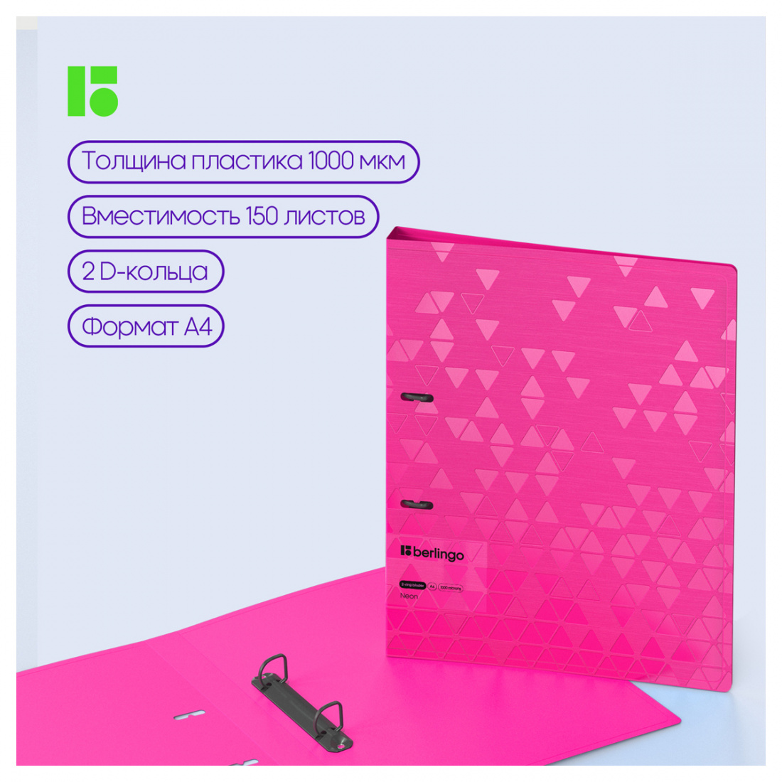 Папка на 2 кольцах Berlingo серии Neon формата А4 (310*250*24 мм) изготовлена из плотного пластика толщиной 1 мм. Вместимость папки – 150 листов, ширина корешка – 24 мм. Кольцевой механизм с 2 кольцами диаметром 20 мм надежно держит перфорированные документы и документы, помещенные в файлы-вкладыши. Специальная D форма колец помогает удобно и ровно хранить документы, которые могут быть выровнены по левому краю, благодаря боковой вертикальной стенке кольца. Диаметр колец – 20 мм. Специальные формовые отверстия в обложке служат для надёжного защелкивания папки в сложенном виде, предотвращают случайное открытие обложки и замятие документов внутри при хранении и транспортировке. Изготовлена из высококачественного полипропилена с матовой текстурой поверхности «рельефные треугольники», на которой не видно отпечатков пальцев и мелких царапин. Предназначена для хранения документов. На внутренней стороне обложки оснащена плотным прозрачным карманом для удобного хранения мелочей: ручки, заметок, визиток, дисков, флешек и др. Упакована в индивидуальный прозрачный пакет по форме.