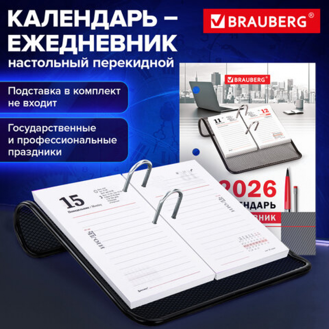 Настольный перекидной календарь BRAUBERG представляет собой сменный блок для календарной подставки. Внимание! В комплект с календарем подставка не входит. Блок календаря на 2026 год напечатан на офсетной бумаге плотностью 60 г/м2 в две краски с выделением цветом выходных и праздничных дней. Справочная информация на 320 листах: календарь на текущий месяц, часы восхода и захода солнца, долгота дня, лунный календарь, информация о государственных, профессиональных, международных и религиозных праздниках. Вертикальное расположение. Размер – 10х14 см. Поставляется в индивидуальной упаковке. Главной особенностью является увеличенное количество листов, для каждого дня отведена не одна страница, а две (полный разворот). На странице справа размещена календарная сетка текущего квартала. Закажите настольный перекидной календарь-ежедневник BRAUBERG — ваш идеальный инструмент для эффективного планирования!