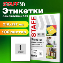 Этикетка самоклеящаяся 210х297 мм, 1 этикетка, белая, 80 г/м2, 100 листов, STAFF BASIC, 115668Артикул: 44096
