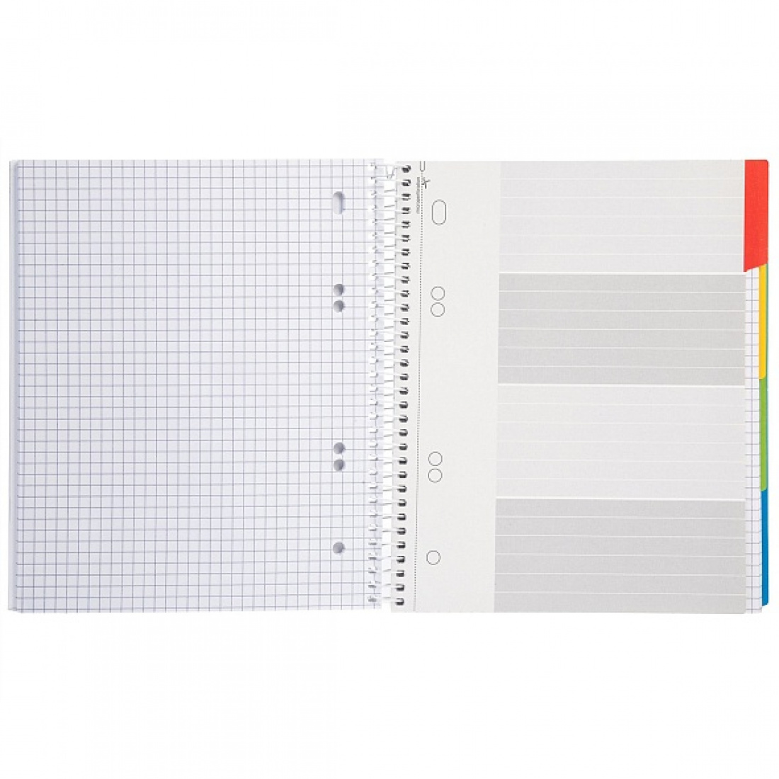 Тетрадь А5 формата 120 листов.Обложка: твердая.Внутренний блок: офсет 65 гр., серая клетка, многоуровневая перфорация, 4 цветных разделителя. Скрепление: спираль.Тетрадь предназначена для записей, подойдет для старшей школы, вуза, дома и офиса. Разноцветные картонные разделители внутреннего блока помогут разбить информацию на 5 тематических разделов. Внутренний блок имеет микроперфорацию на отрыв и универсальную перфорацию для подшивки листов в папку. Скрепление 'спираль' позволяет раскрывать тетрадь на 360 градусов.