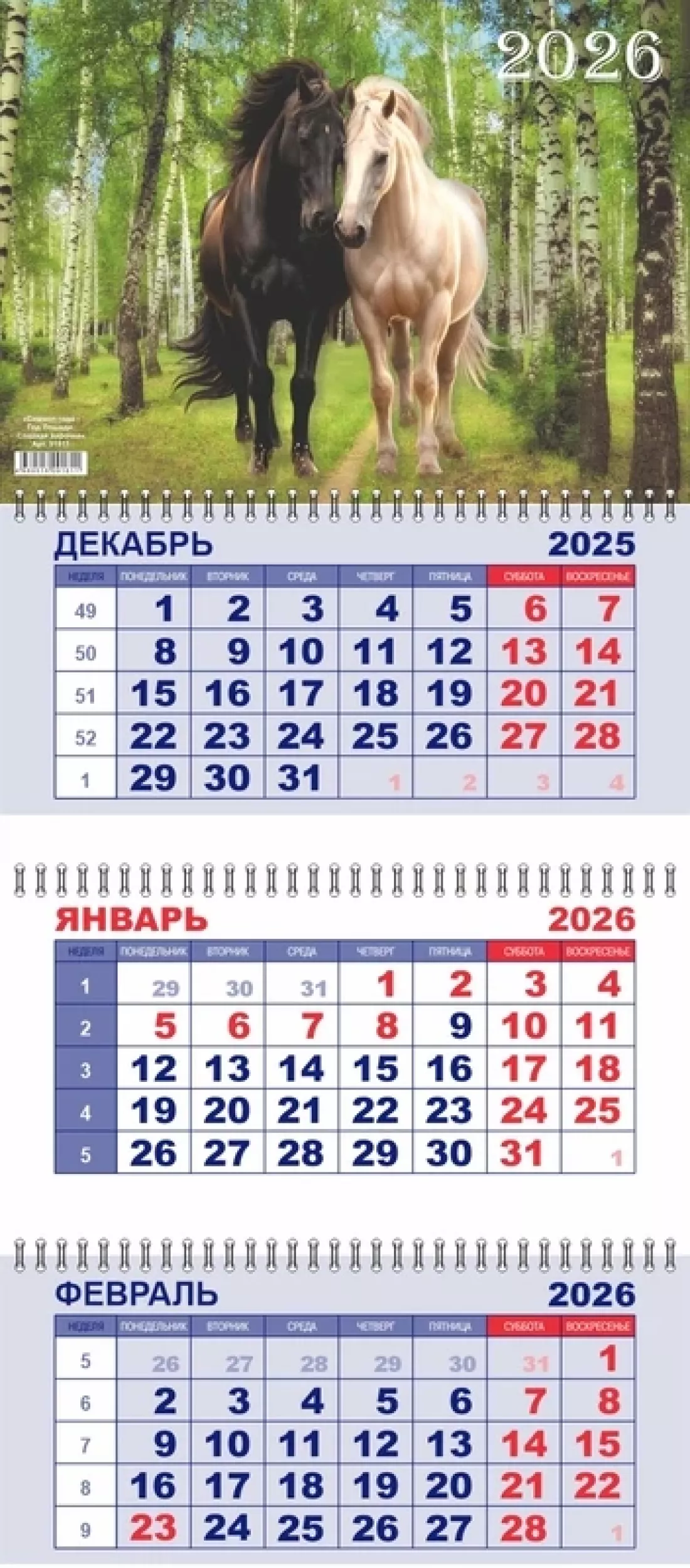 Календарь квартальный на 2026 г., 3 блока, 3 гребня, бегунок, "Лошади. Сладкая парочка" LAMARK91811Артикул: 44290