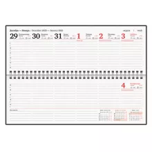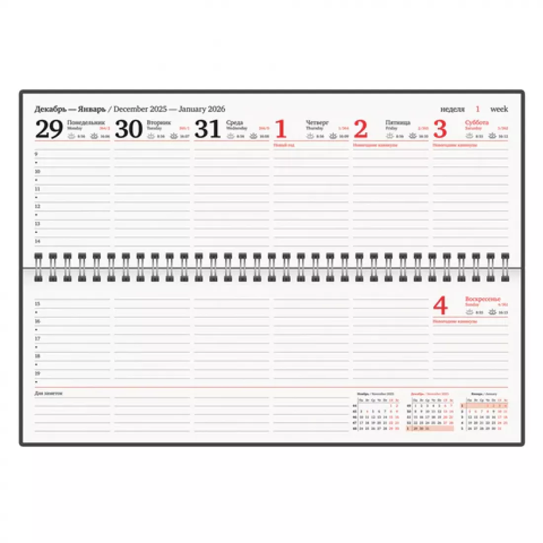 Внутренний блок содержит 60 листов офсетной бумаги белого цвета плотностью 70 г/м2. Обложка из балакрона и твердый переплет обеспечивают долгий срок службы. Для заметок в планинге имеется 11 страниц в конце внутреннего блока. Подходит для тиснения только фольгой. Скрепление осуществляется с помощью евроспирали. Размер изделия – 305х140 мм.