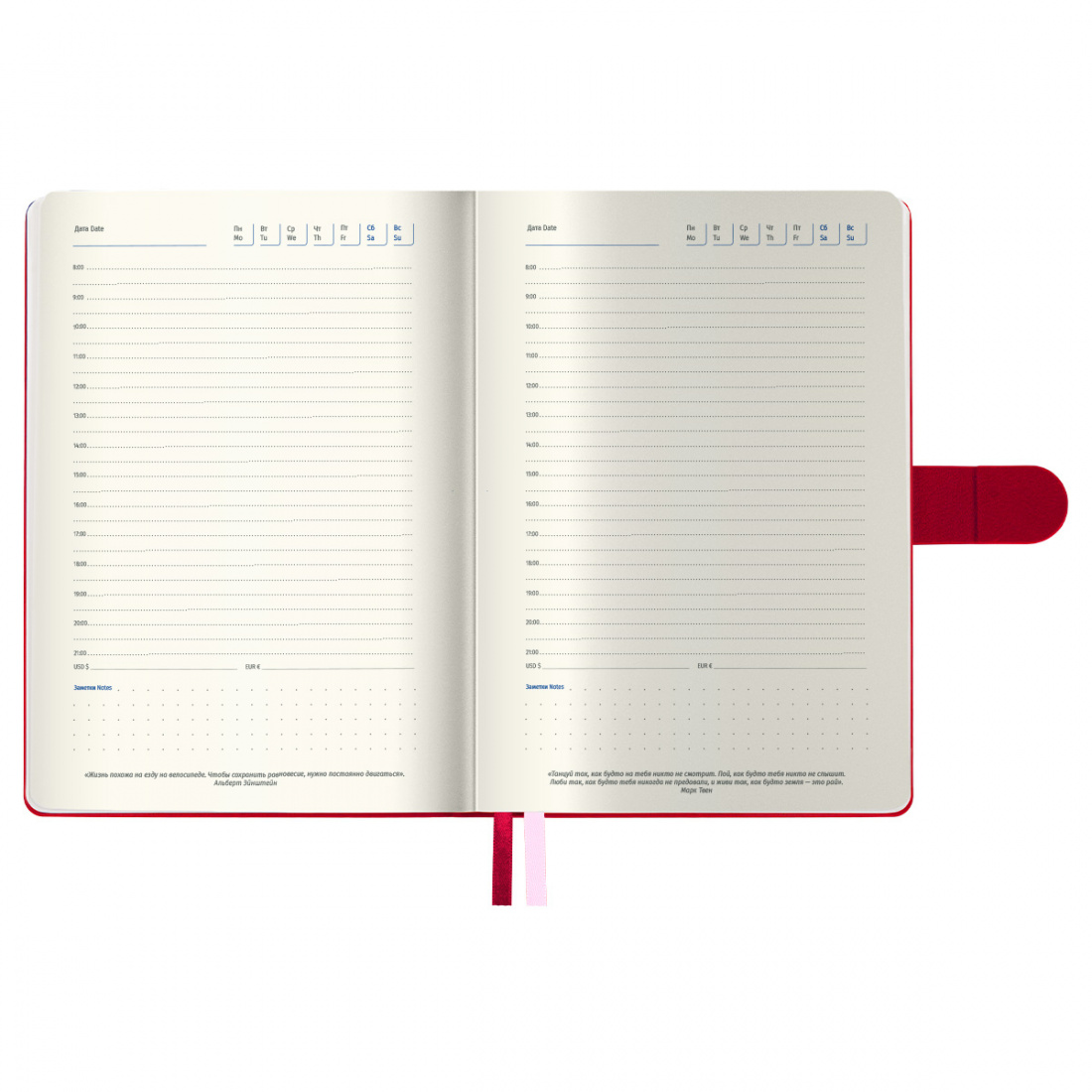 Классический недатированный ежедневник Berlingo "Symbol" формата А5 с интегральной обложкой из фактурной экокожи красного цвета с элегантным глубоким тиснением. Магнитная застёжка надёжно фиксирует ежедневник в закрытом состоянии, а также может быть использована для крепления ручки. Внутренний блок состоит из 136 листов высококачественной кремовой бумаги повышенной плотности 80 г/м² с пантонной печатью в 2 краски. Размер ежедневника – 155 на 213 мм. Обновлённый внутренний блок содержит различные разделы как для организации рабочего времени, так и для систематизации личных планов, а также мотивирующие цитаты на каждый день. Раздел с постановкой годовых целей с разбивкой на этапы поможет сохранять фокус на самом важном. В ежедневнике выделен отдельный блок для заметок на отрывных листах. Дополнительный внутренний конверт поможет хранить необходимые заметки. 2 закладки-ляссе сделают использование ежедневника Berlingo комфортным. Комплект красочных наклеек внутри ежедневника станет приятным подарком. Упакован в индивидуальный брендированный пакет с клеевым клапаном.
