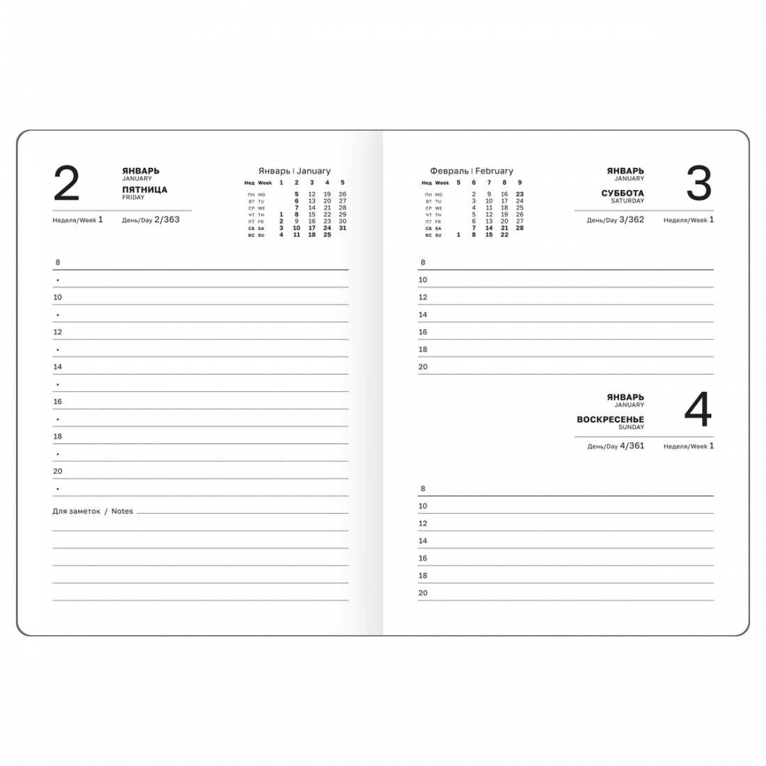 Формат – А6 (105*145 мм). Изделие состоит из 176 листов белой бумаги плотностью 65 г/м2, которая подходит для любых типов ручек и не будет просвечиваться. В линованный блок с полем для даты и планингом удобно записывать встречи, идеи и задачи. Уголки листов с перфорацией. Закладка-ляссе позволит быстро и легко найти нужную страницу, что делает навигацию по ежедневнику удобной и эффективной. В ежедневнике предусмотрена справочная информация, ежемесячный планер, календарь и другие полезные сведения. Индивидуальная упаковка в термоусадочную пленку.
