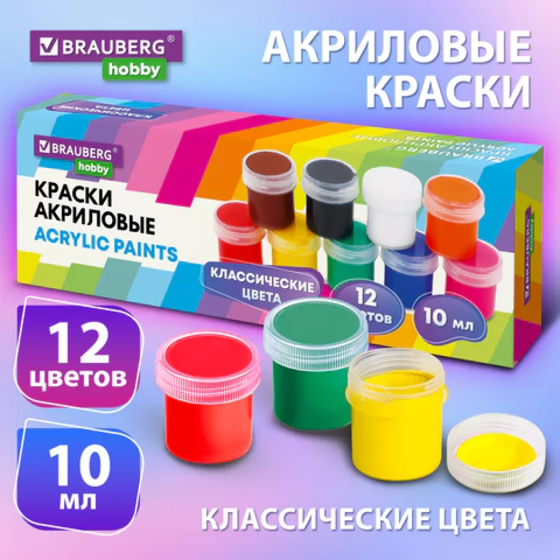 Краски акриловые 12 цветов по 10 мл, BRAUBERG HOBBY, 192433 (16)