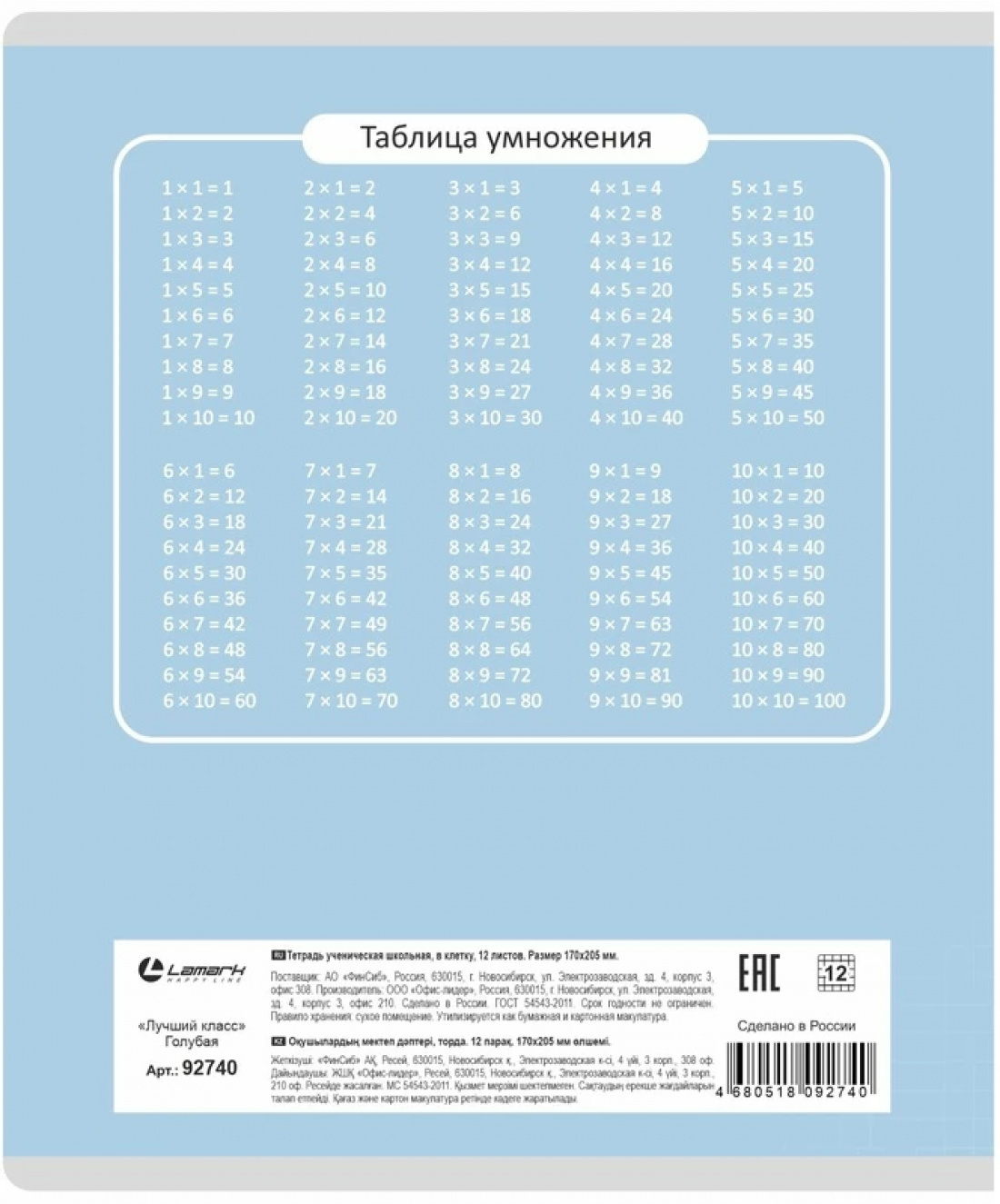 Тетрадь 12 л клетка "Лучший класс" Голубая LAMARK92740 (10/240)Артикул: 44728