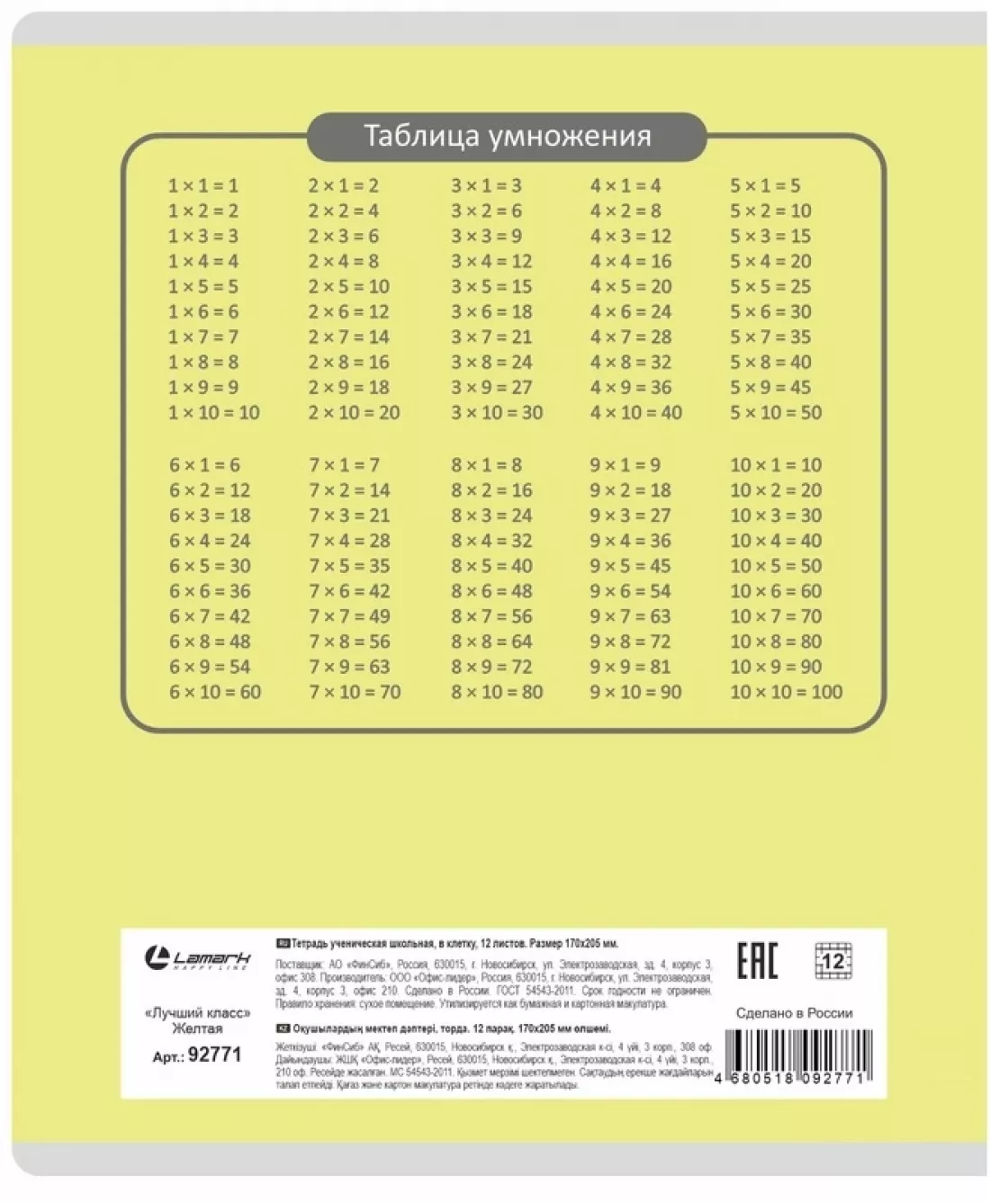 Тетрадь 12 л клетка "Лучший класс" Желтая LAMARK92771 (10/240)Артикул: 44729