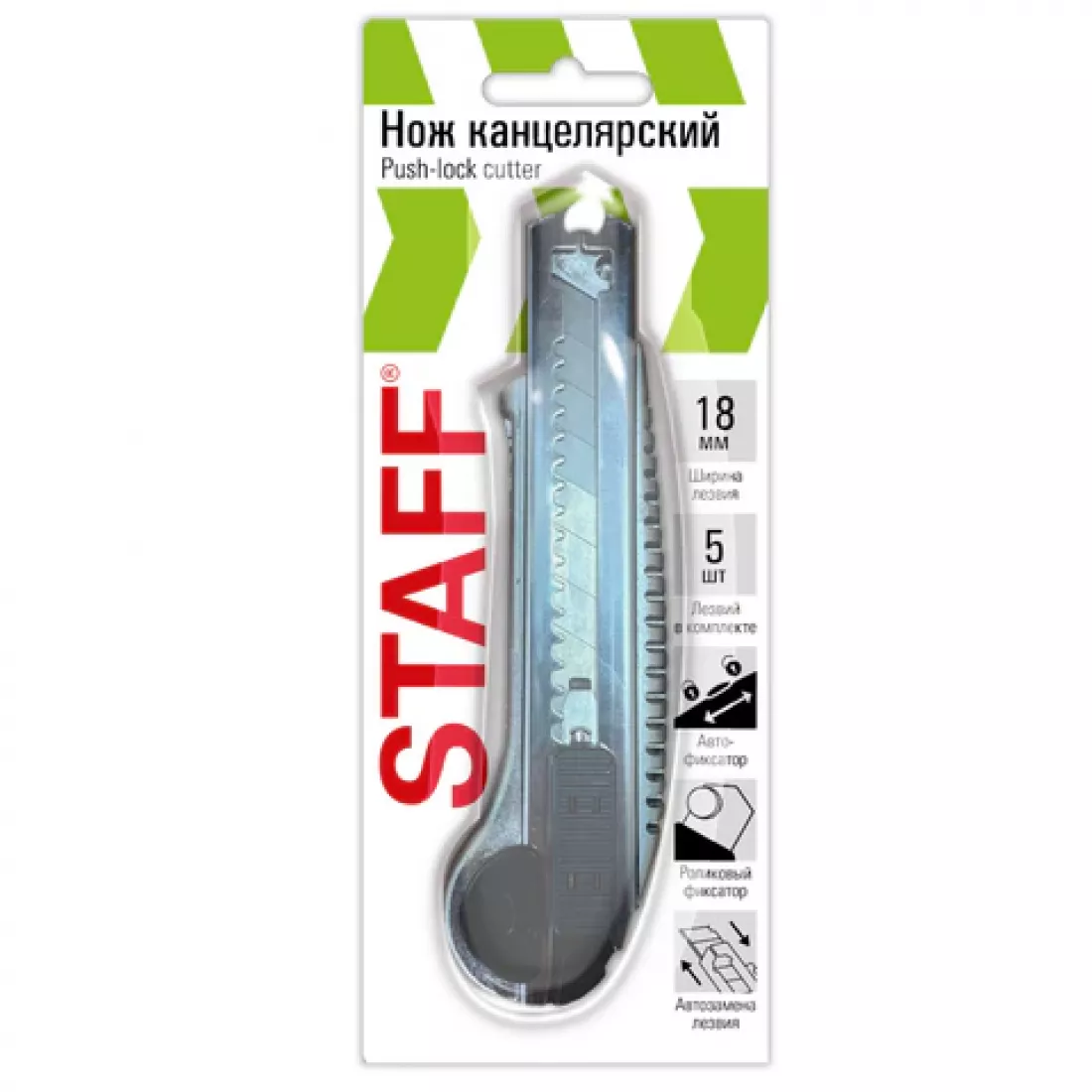 Канцелярский нож STAFF – универсальный, удобный и простой инструмент, который применяется во многих сферах: на складе, в офисе, строительстве, производстве, творчестве и дома. Предназначен для резки различных материалов разной плотности и толщины. Благодаря своей обтекаемой форме нож удобно держать в руке. Пластиковый корпус гарантирует безопасность применения. Автофиксатор позволяет закрепить лезвие в нужном положении с помощью защелки. Для того, чтобы хранить и переносить инструмент было проще, в корпусе имеется небольшое отверстие. Нож усилен металлическими направляющими, которые надежно удерживают лезвие шириной 18 мм и позволяют выдерживать большую нагрузку. Чтобы восстановить функциональность инструмента из-за затупившегося лезвия, необходимо обломать его по наклонной метке на поверхности лезвия. При этом его нужно выдвинуть только на одно деление. В щель на снятой крышке необходимо поместить затупившийся край лезвия ножа. Инструмент нужно держать в руках таким образом, чтобы лезвие было обращено вверх той стороной, где нет разделительных меток. После этого необходимо согнуть лезвие по линии излома ОТ СЕБЯ. При этом затупившийся обломок остаётся в щели крышки, а инструмент вновь становится пригодным к полноценной работе. Канцелярский нож STAFF – ваш надежный помощник в решении различных задач! Выгодно и удобно! Закажите сейчас!
