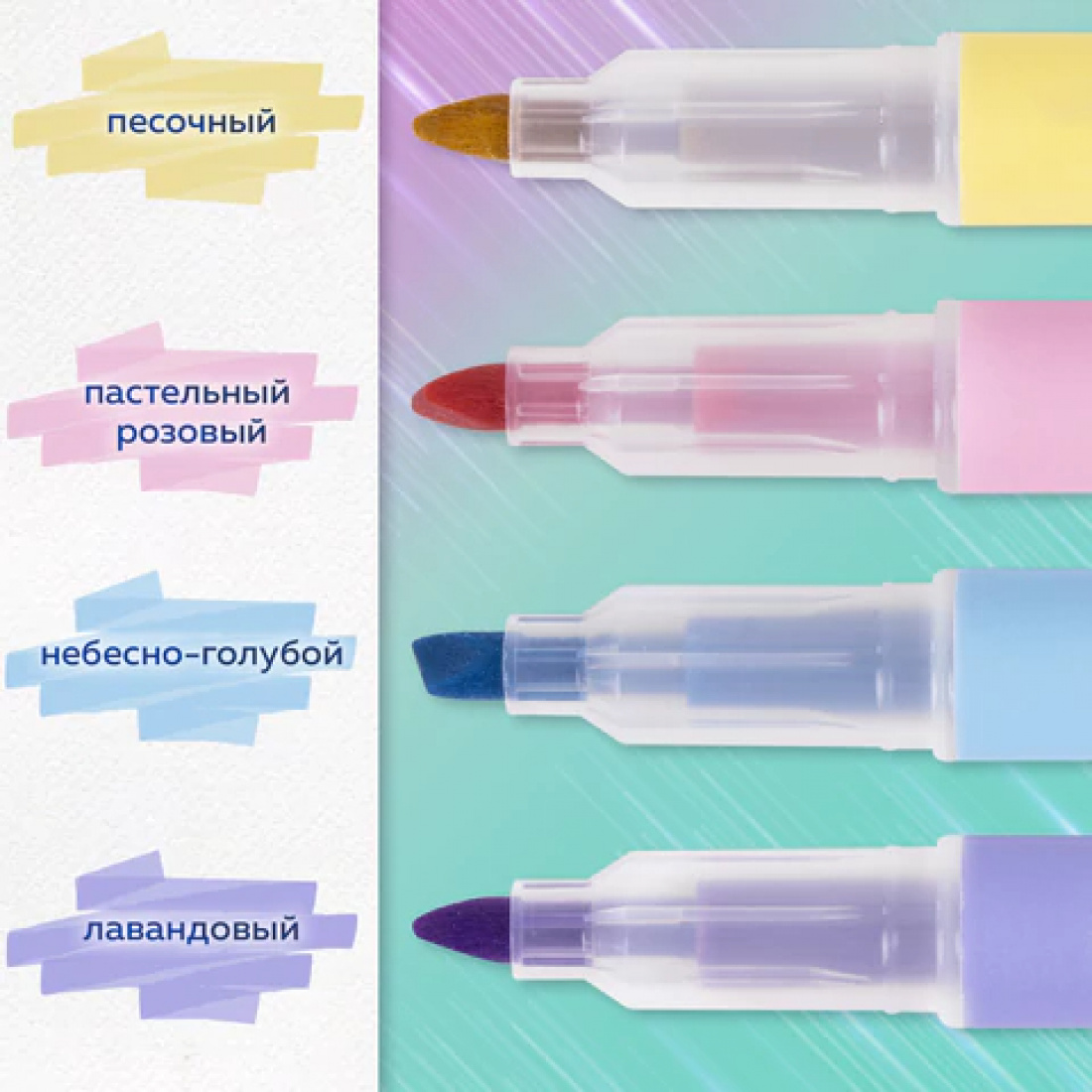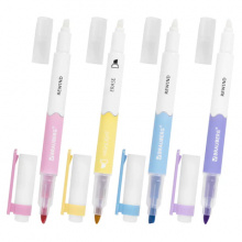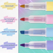 В наборе – 4 двусторонних стираемых текстовыделителя со стирателем: небесно-голубой, пастельный розовый, песочный, лавандовый. Имеют корпус круглой формы диаметром 11 мм.