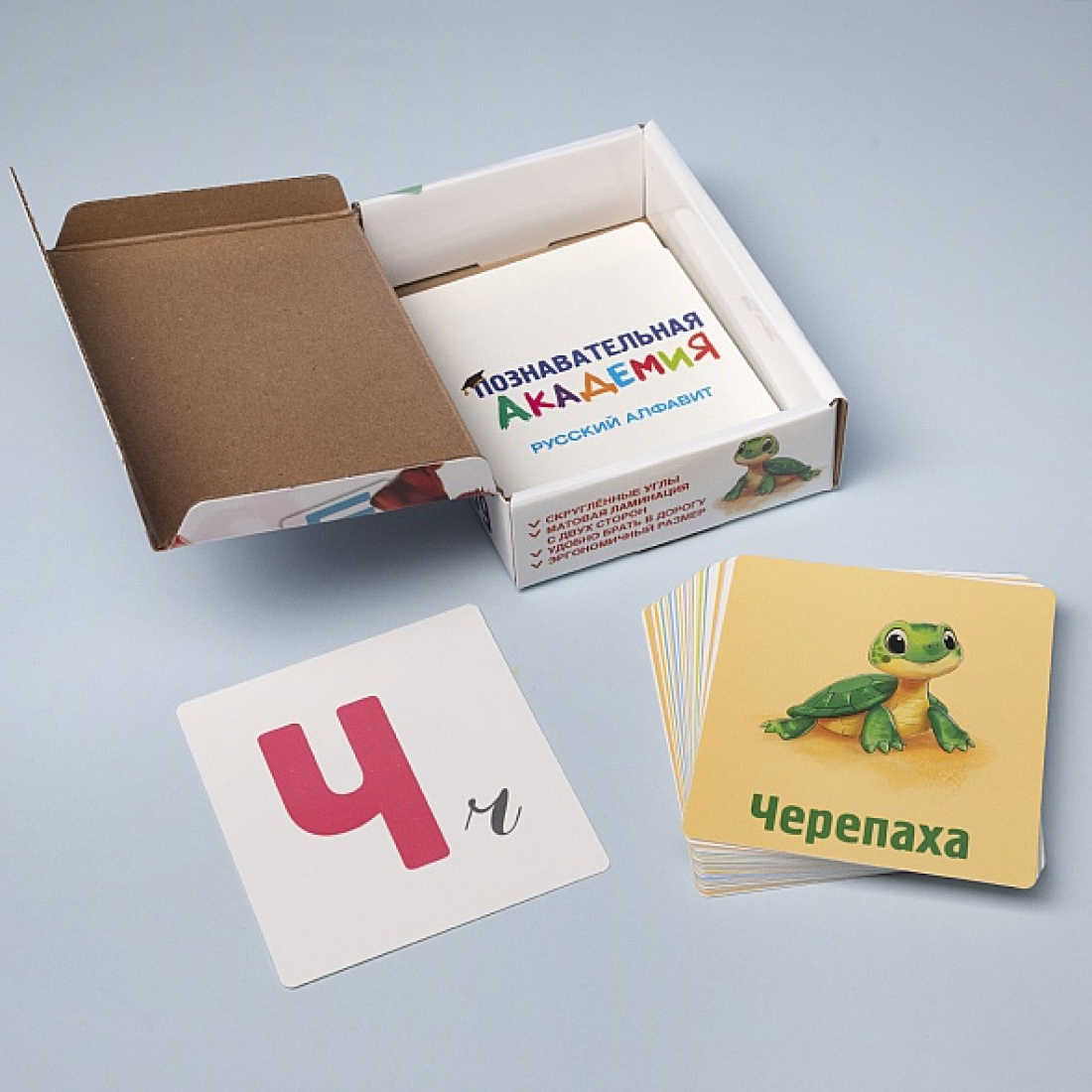 Развивающие карточки «Познавательная академия» изготовлены из мелованного картона с покрытием софт-тач - тактильно приятные и устойчивые к износу. Скругленные углы обеспечивают безопасность даже для самых маленьких детей. Компактная глянцевая коробка для хранения - яркая и прочная, позволяет брать набор с собой в дорогу, делает набор удобным для хранения и отличным вариантом для подарка.· Набор содержит 60 карточек.· Размер карточки 90х100мм. · Размер коробки 100х140х30мм.Набор станет отличным помощником для родителей и педагогов, желающих сделать обучение интересным, наглядным и эффективным! «Познавательная академия» - это эффективный инструмент для освоения базовых понятий и раннего развития.«Русский алфавит» - это красочные карточки с русскими буквами, словами и иллюстрациями к ним, которые помогут быстро освоить алфавит и пополнить словарный запас.
