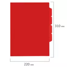 Папка формата А4 выполнена из высококачественного полипропилена плотностью 150 мкм. Она предотвращает смятие, загрязнение или намокание бумаг. Имеет 3 отделения, разделенных ярлычками. Непрозрачный материал способен скрыть содержимое от посторонних глаз. Данная папка заметно выделяется среди других благодаря насыщенному красному цвету.