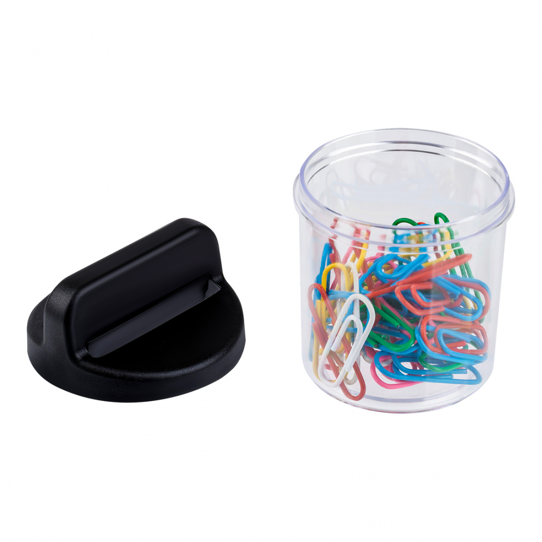 Компактный и лёгкий диспенсер круглой формы изготовлен из качественного пластика. Размер изделия — 50*70 мм. Скрепочница оснащена магнитом внутри крышки для удобной фиксации скрепок. Цвет скрепочницы — прозрачный с чёрной крышкой. Поставляется в картонной коробке.