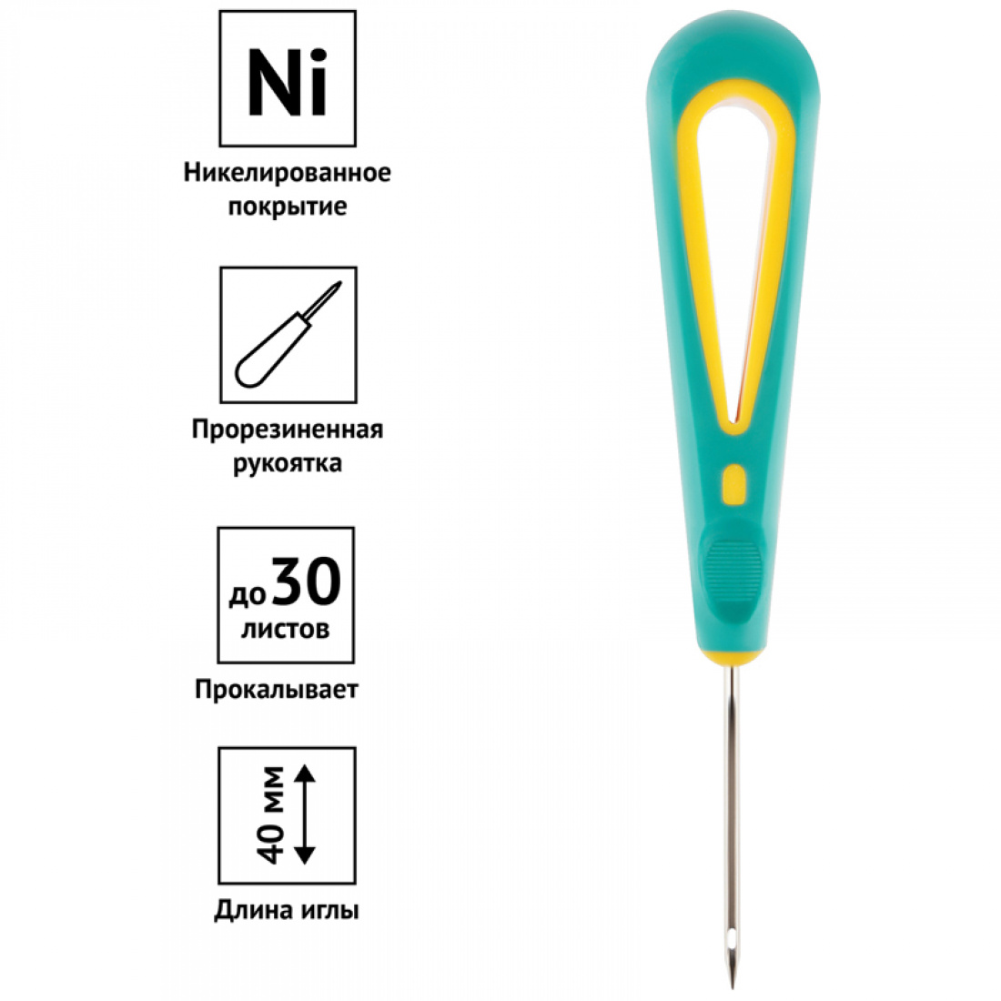 Канцелярское шило используется для прошивки документов и прокалывания бумаги. Оснащено ушком для продевания нити. Пластиковая прорезиненная рукоятка (составная, зеленый + желтый). Диаметр иглы 3 мм, длина иглы 40 мм, никелированное покрытие. Общая длина 140 мм, обеспечивает прокалывание до 30 листов бумаги.