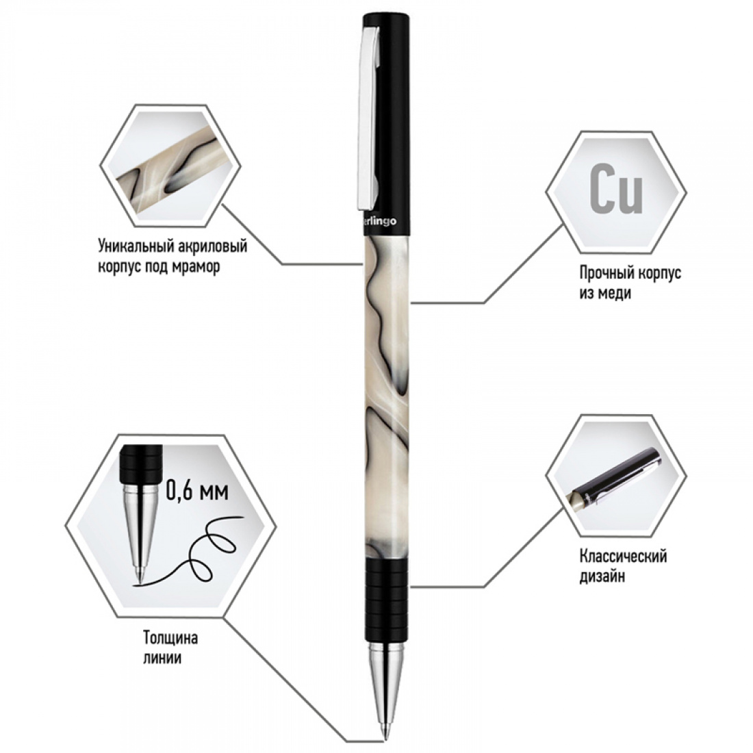 Для ярких, неординарных личностей прекрасно подойдёт шариковая ручка Berlingo Fantasy. Она станет отличным подарком для людей, которые любят выражать свою индивидуальность – достаточно взглянуть на её необычный дизайн. Акриловый корпус создаёт эффект «под мрамор», а сочетание бежевого и черного цветов – контраст. Металлический грипп имеет рифление, что делает его нескользящим. На колпачке имеется хромированный клип, который позволит закреплять ручку где потребуется и работать комфортно. Изделие можно использовать для любого стиля письма, потому что пишущий узел оставляет линию толщиной 0,7 мм, а толщина линии письма также составляет 0,7 мм.