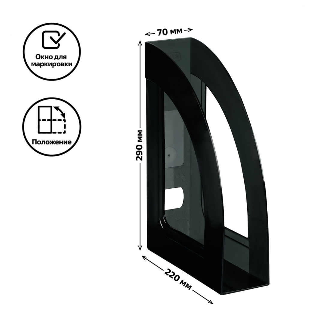 Лоток вертикальный для бумаг "СТАММ" серии "Респект" предназначен для хранения и систематизации бумажной продукции формата А4. Возможность установки в 2-х положениях - вертикальном и горизонтальном. Классический дизайн. Легкий, прочный, устойчивый корпус. На торцевой части есть отверстие для удобной переноски. Конструкция лотка имеет окно для маркировки, предусматривающее возможность смены этикеток. Изготовлен из качественного пластика. Цвет лотка - тонированный черный. Изделие высотой 290мм, глубиной 220мм, шириной 70мм вмещает до 550 листов.