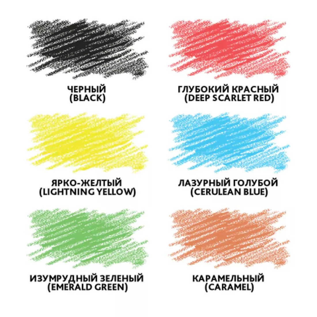 Набор состоит из 6 цветов: красный, желтый, зеленый, голубой, коричневый, черный. Трехгранная форма сечения корпуса позволяет не скатываться карандашу с поверхности стола во время занятий рисованием. Они изготовлены из древесины ценных пород и имеют лакированный корпус. Высокосортная древесина и качество исполнения гарантируют легкую заточку. Грифель диаметром 3,3 мм обладает повышенной прочностью. Все карандаши заточены и поставляются в картонной упаковке с европодвесом.